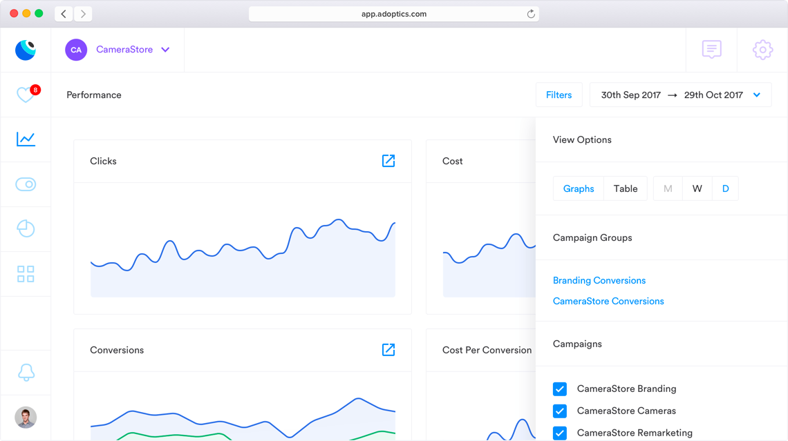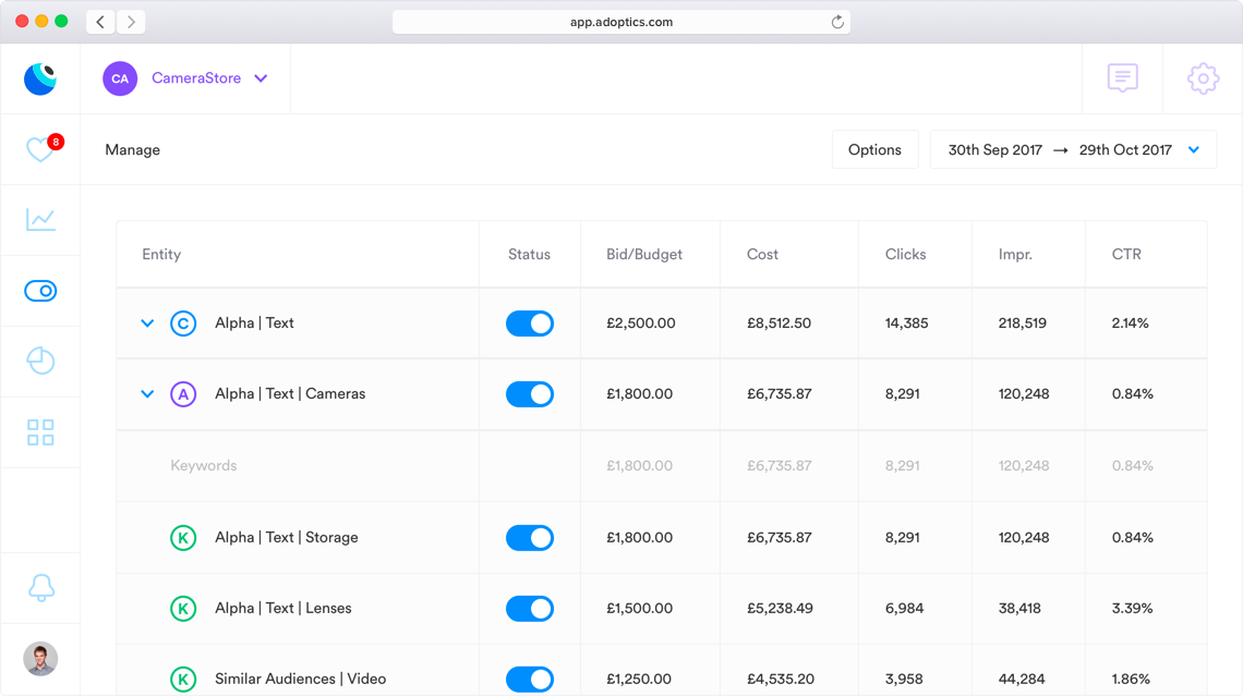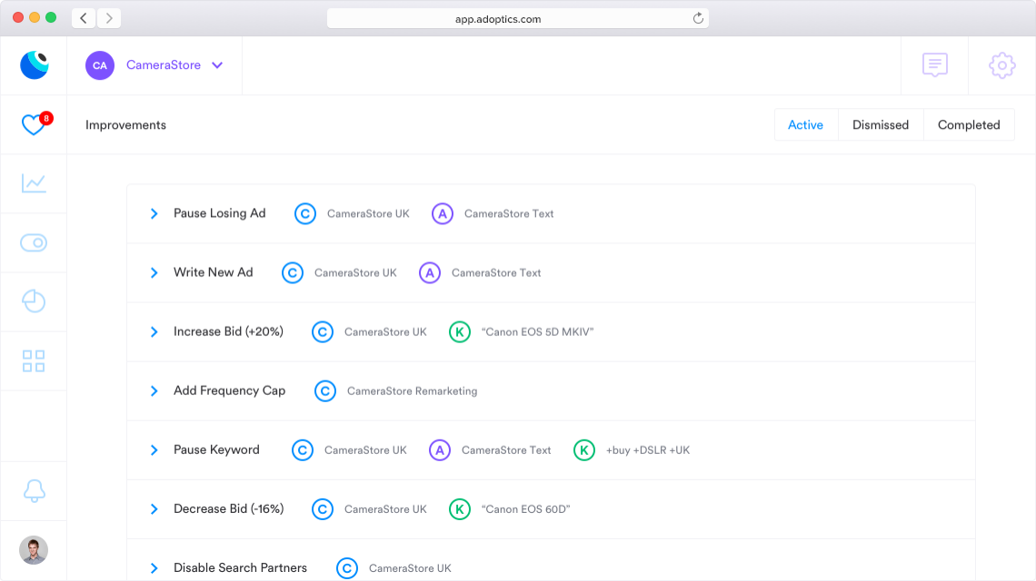 Forget the tedious process of a hundred clicks and spreadsheet tracking needed to test your ad variations. AdOptics automatically suggests ad tests and evaluates winning vs losing ads managed using simple point and click tasks in our dashboard. Start improving your ads today!